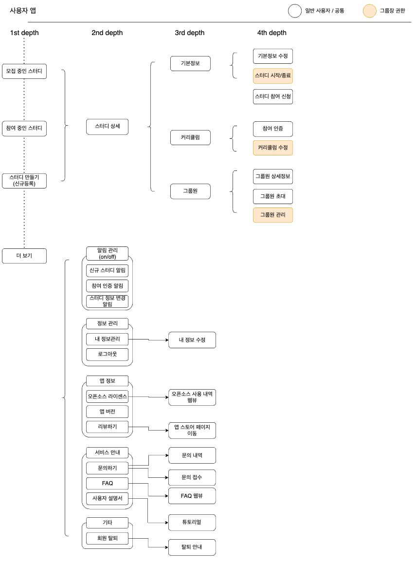 - 스터디 탭으로 구분 시 하위 depth를 표현하기 위해 별도 서브 메뉴 (상단 탭)이 필요할 수 있다.